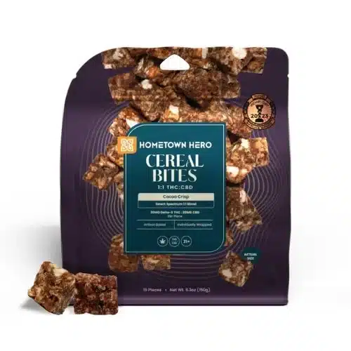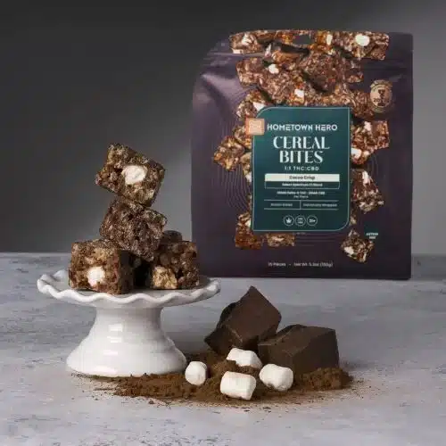 Hometown Hero Cocoa Crisp Cereal Bites bring back that first-bowl-of-the-day excitement, only this time, it’s made for grown-ups. Think chocolatey cereal comfort, soft and chewy texture, and a perfectly balanced 1:1 blend of THC and CBD that feels steady instead of overwhelming. It’s nostalgic, familiar, and just indulgent enough to feel like a treat without turning your whole day sideways.